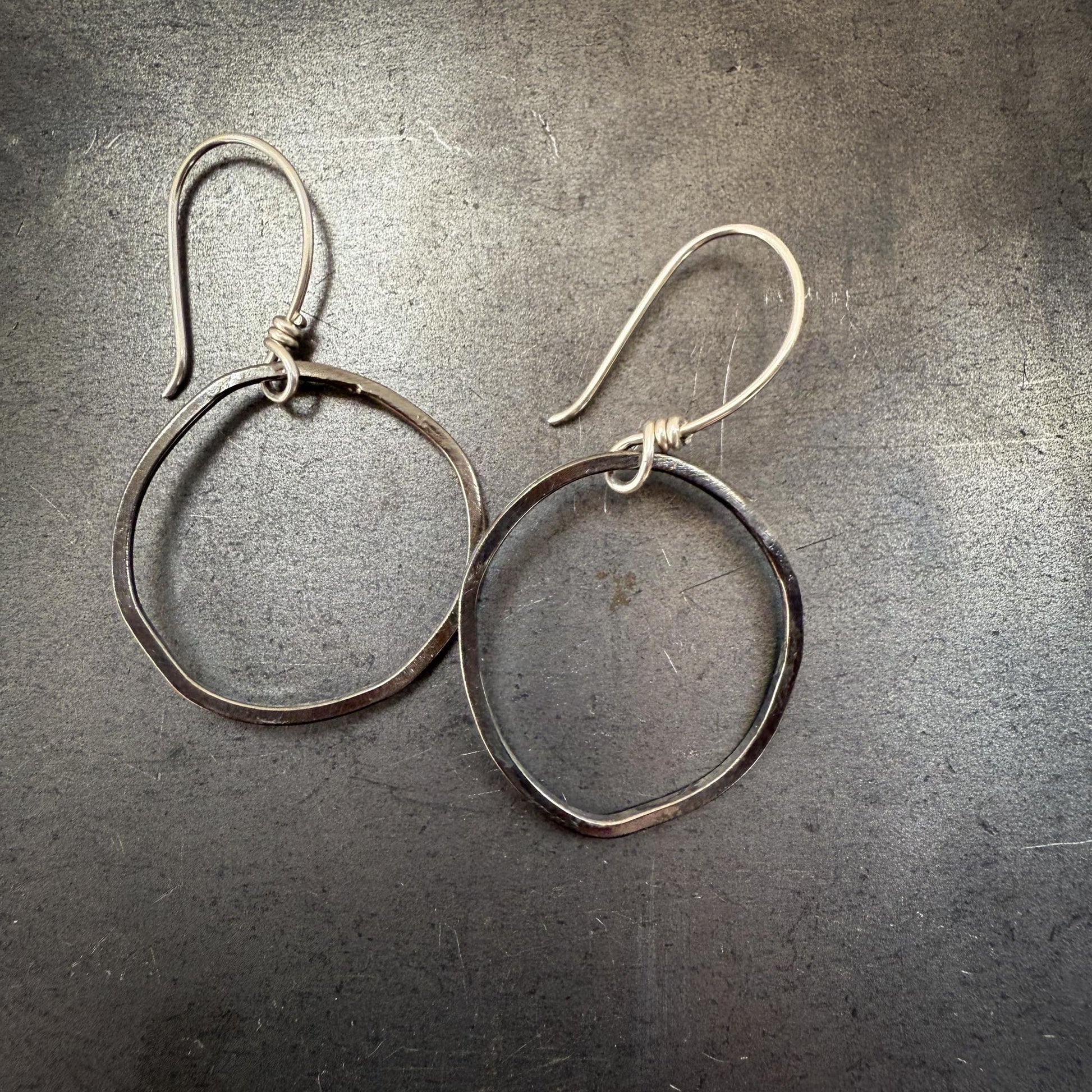 Funky, forward-facing hoops that break the mold with their abstract, not-quite-circular shape. Each pair is hand-formed and finished with a rich dark patina that highlights the organic form.
