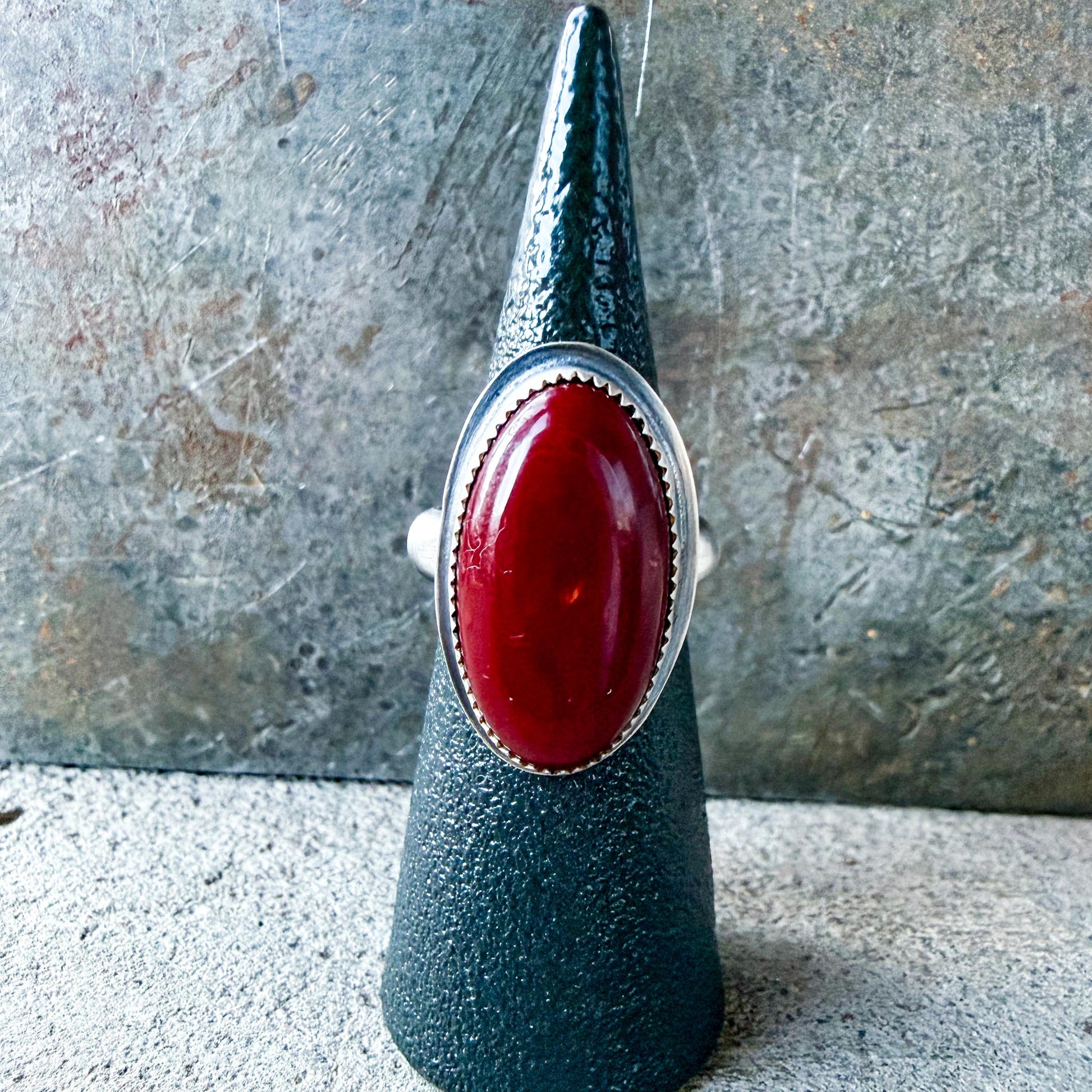 An oval Rosarita stone set in sterling silver. Rosarita is created during the gold-refining process, formed in intense heat, which gives it its vivid red glow. It is often seen as a symbol of walking through fire and emerging transformed. A striking, meaningful piece for anyone who has moved through challenge and come out stronger.