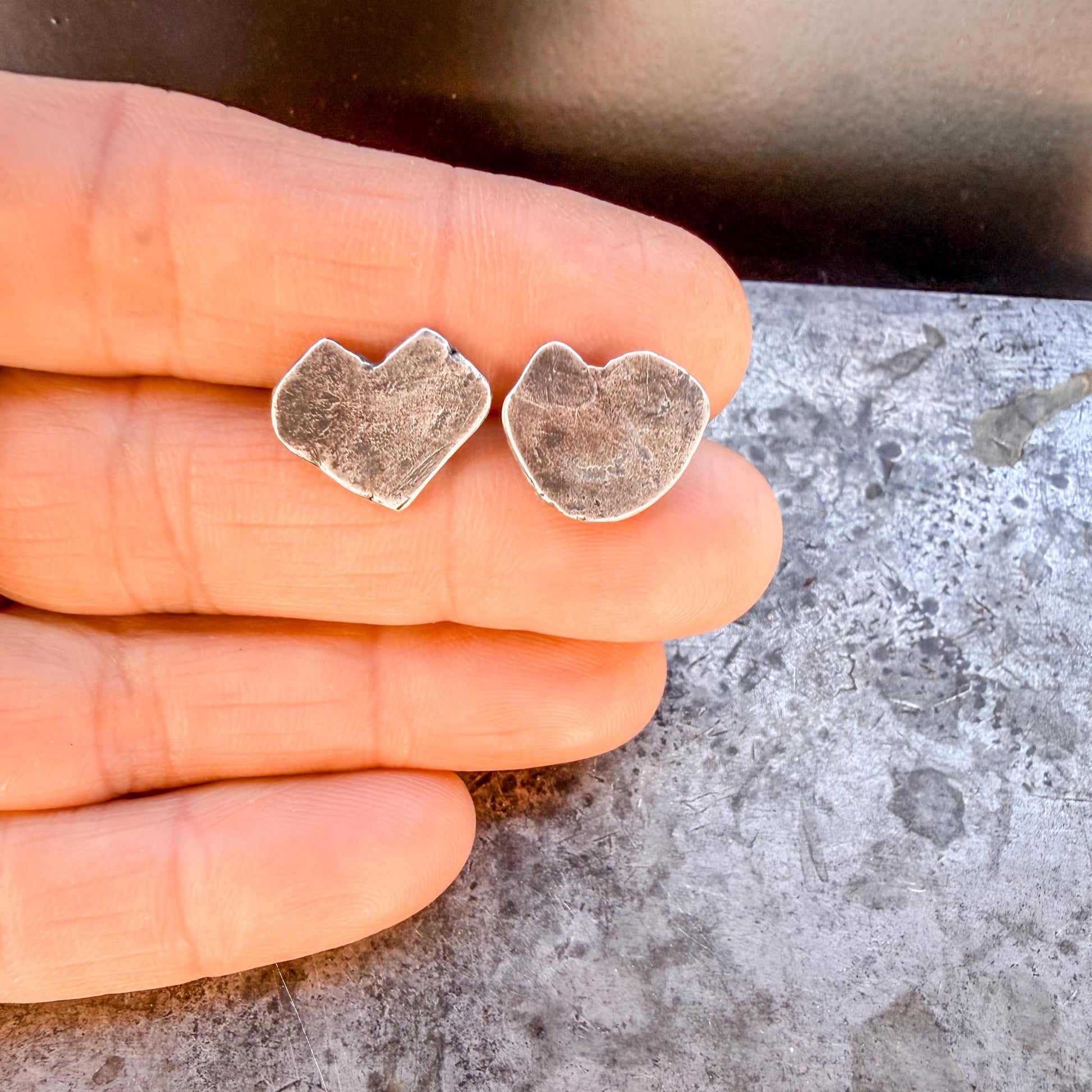 Made with recycled sterling silver, hand-fabricated by fusing silver together and shaping into asymmetrical heart studs.
